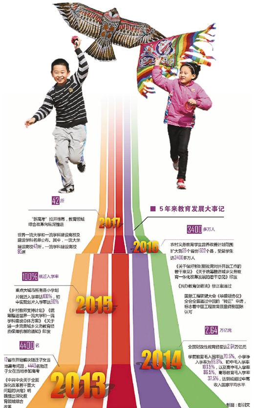 5年来,中国教育优先发展,教育质量不断提升,教育公平受益面不断扩大,中国正努力用更好的教育回应人民的热切期盼。