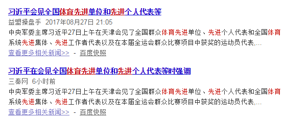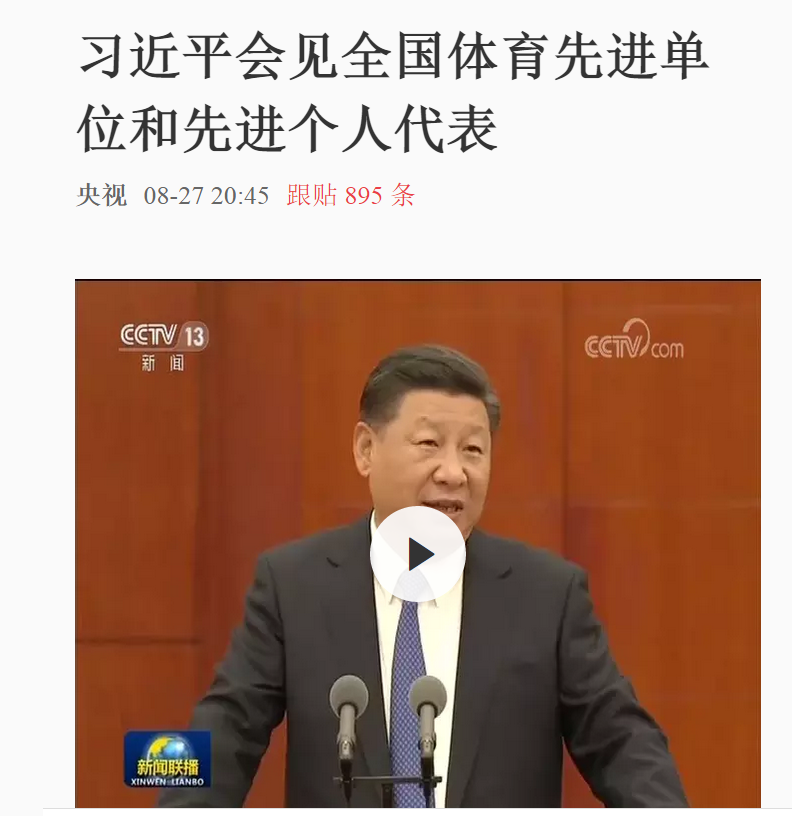 习大大8月27日上午在天津会见了全国群众体育先进单位、先进个人代表和全国体育系统先进集体、先进工作者代表以及在本届全运会群众比赛项目中获奖的运动员代表,并发表重要讲话。