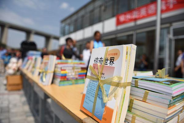 华尔街英语员工和志愿者为红旗小学的孩子们捐助了上千本课外阅读书