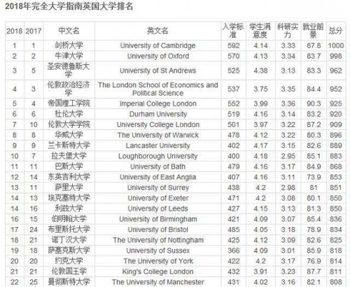 根据泰晤士报发布的“英国最佳大学排名指南”显示,根据院校的入学标准、教学水平、学生满意度等指标得出的排名榜可以看到剑桥以及牛津长期处于前两名,其中最受英国顶级雇主招聘青睐的目标院校有曼彻斯特大学、伯明翰大学、华威大学、布里斯托大学以及伦敦大学学院。