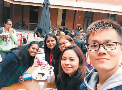 颜仕琦(右一)时常与同学出去聚餐,但他更喜欢自己在家做中国美食。他精湛的厨艺吸引了很多同学到家里做客。